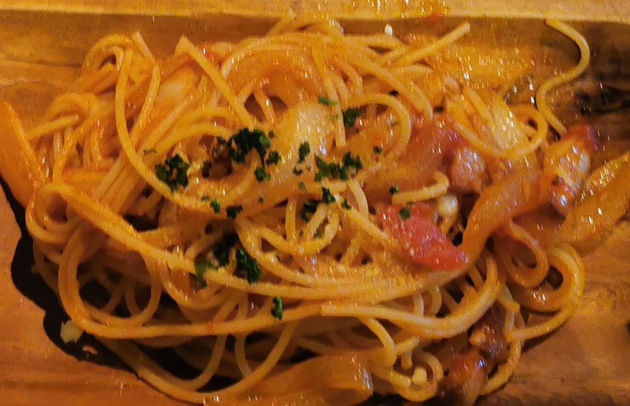 麺はナポリタンのように見えつつ、口にするとしっかりアルデンテ。