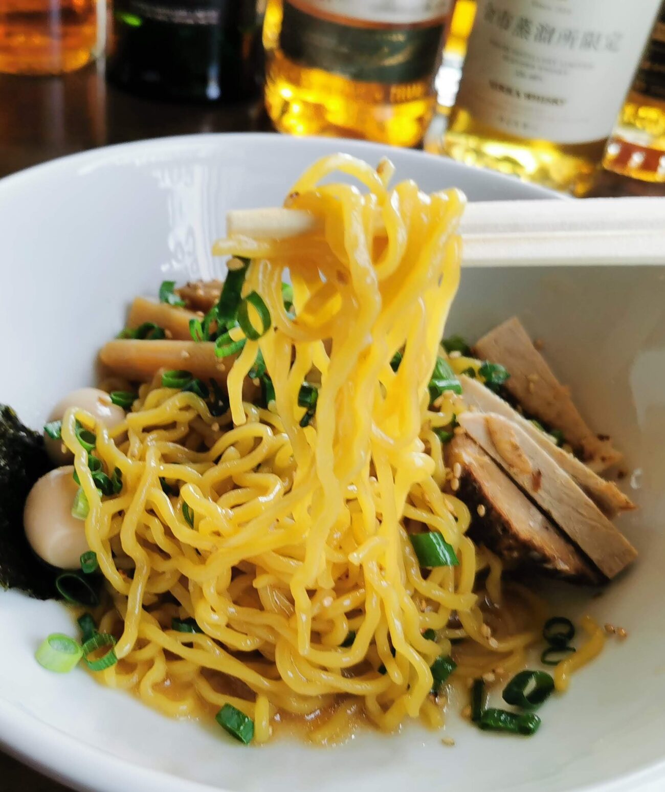 トッピングは、チャーシュー、メンマ、うずら玉子、刻みネギ、そして海苔。見た目はシンプルながら、しっかりとまとまっています。