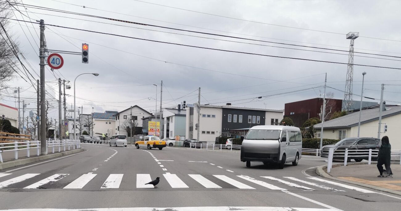 このカラス、ちゃんと信号のある横断歩道を渡るのです。その様子にバンの運転手さんも停止。