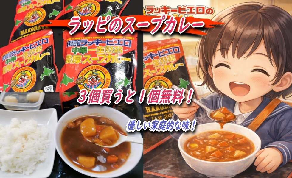 レトルトのスープカレーを「3個買うと1個おまけ」という、つい手が伸びてしまうやつです。