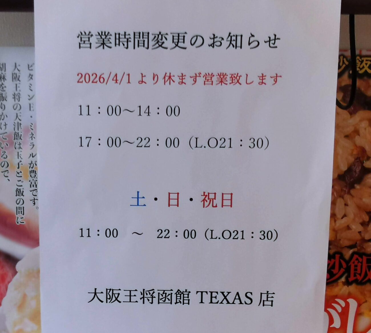 函館の大阪王将 テキサス函館店です。