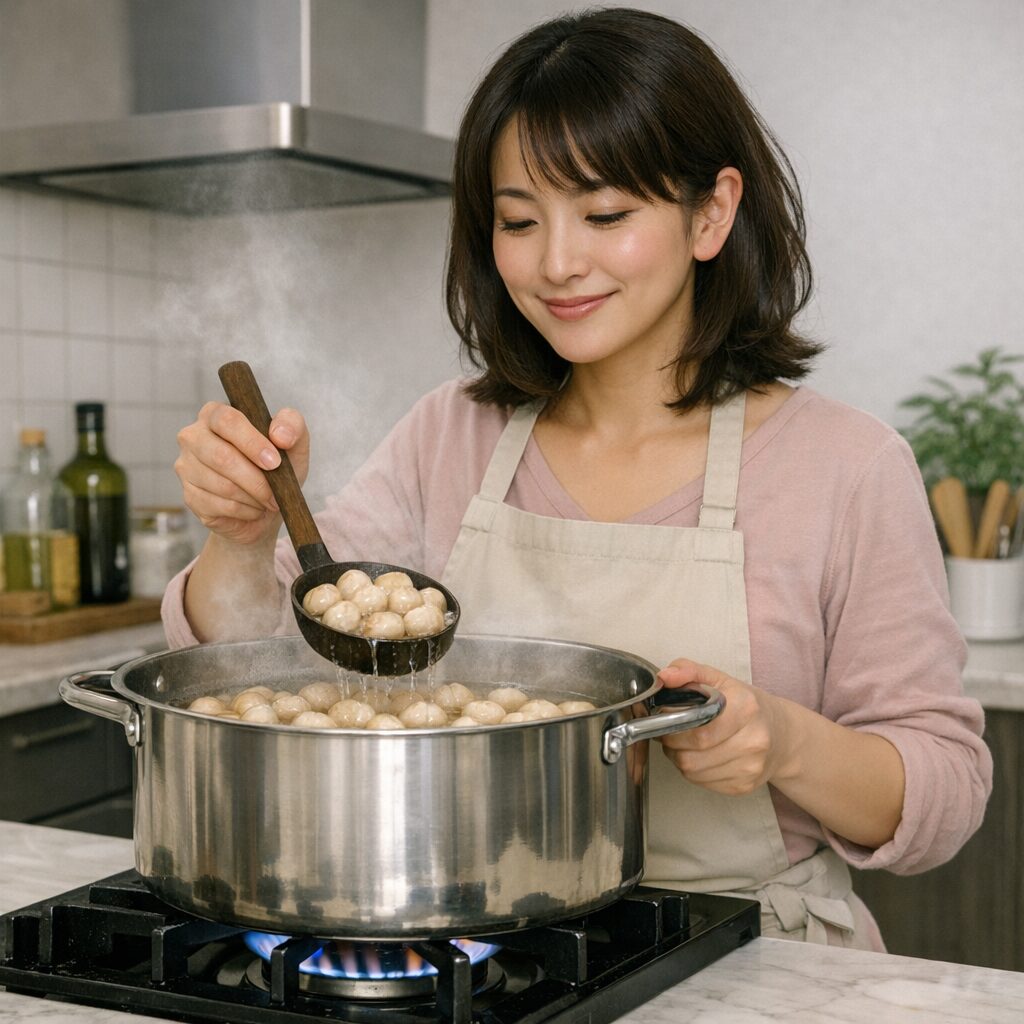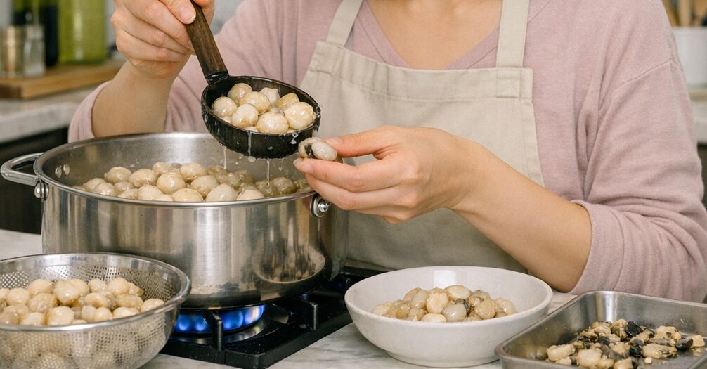 もらってくるのは生のホタテなので、大きな鍋に入れて茹でます。多いので何度か煮ます