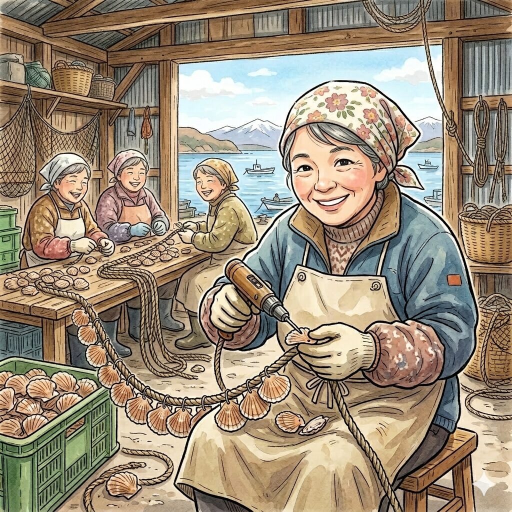 画像をホタテ漁師の作業小屋でおばちゃんが作業しているイラストを作ってみました。