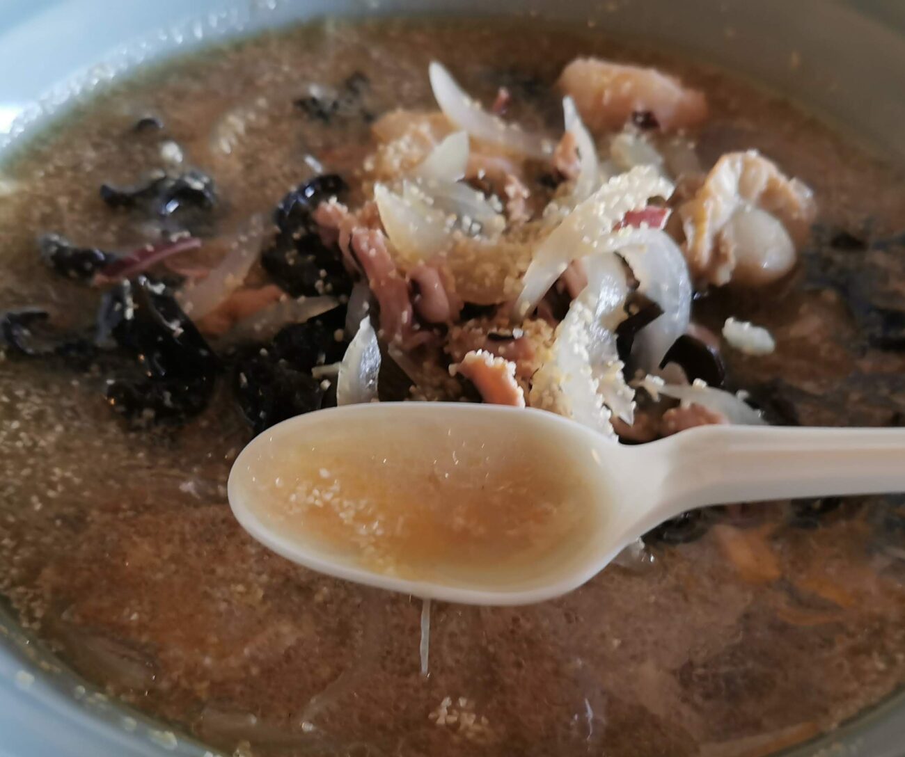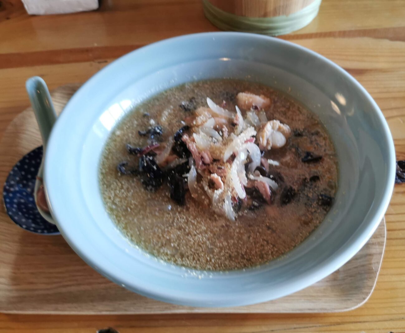横から見てみると、レンゲに塩辛が添えられているのはわかります。