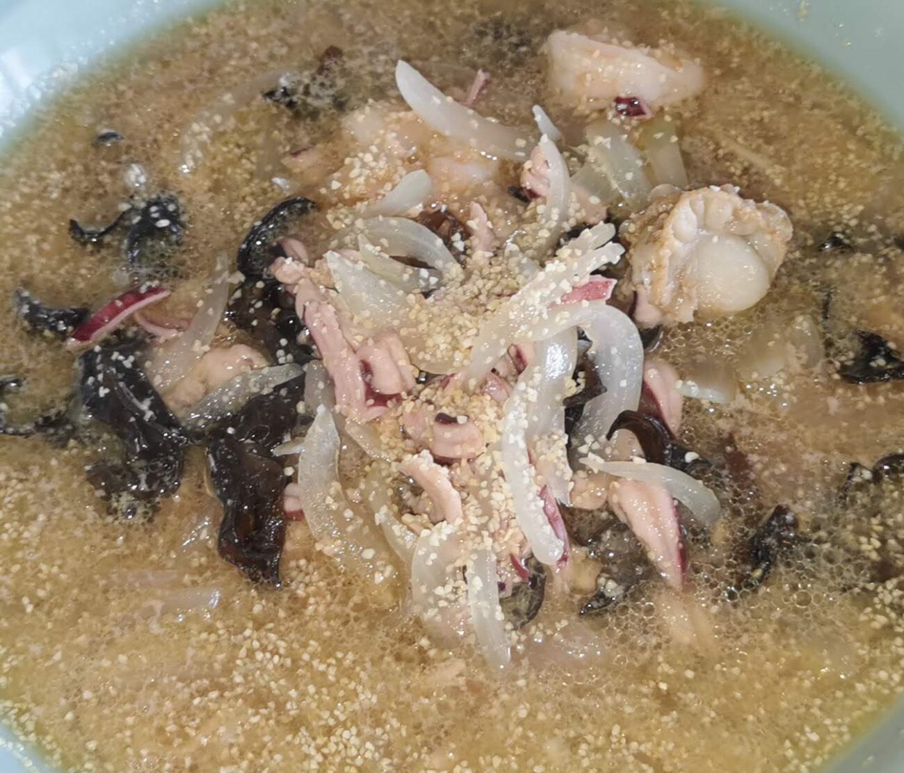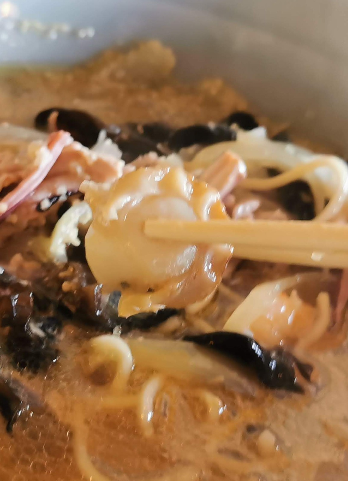 魚介の旨みが凝縮されたオイルベースのスープに、塩辛を溶かしながらいただきます。