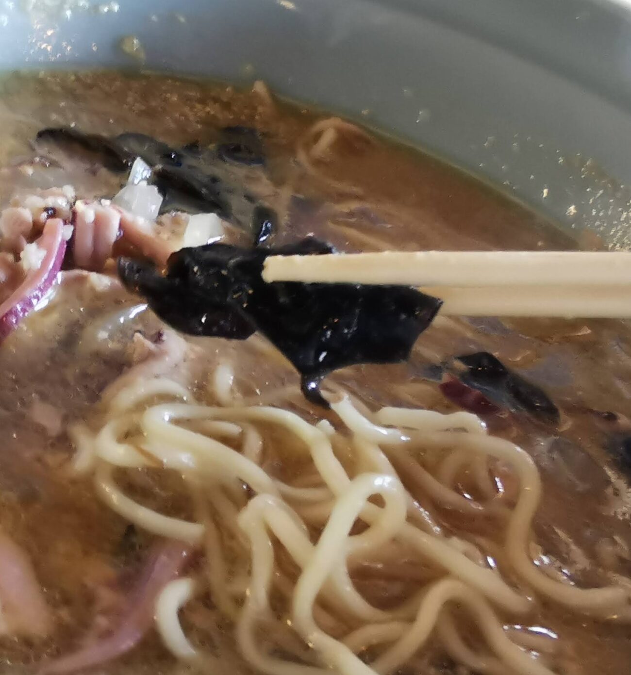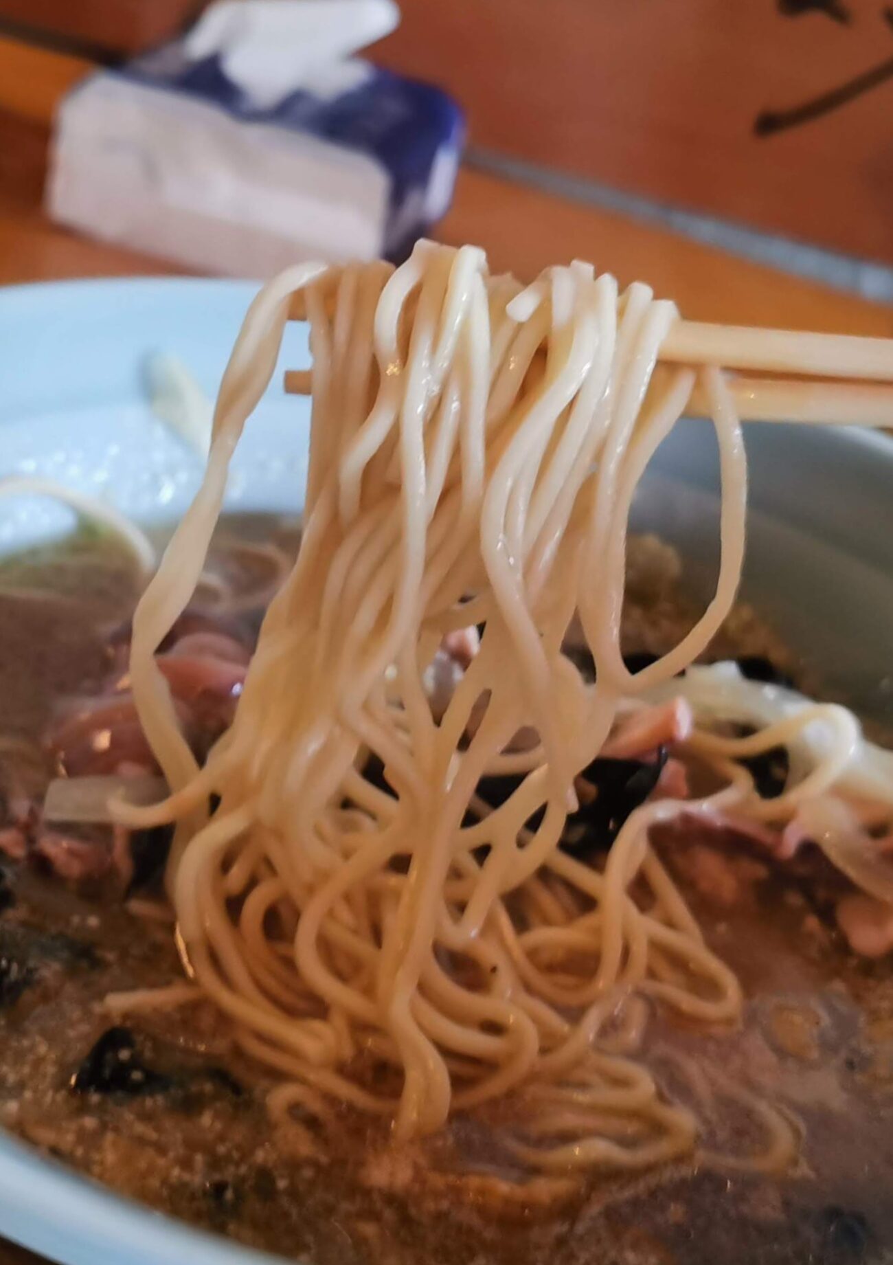麺を持ち上げると、旨みをたっぷりと纏ったストレート麺が顔を出します。