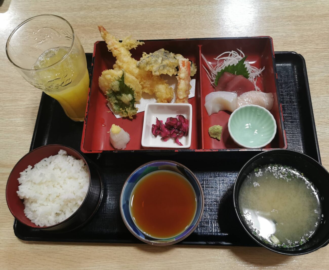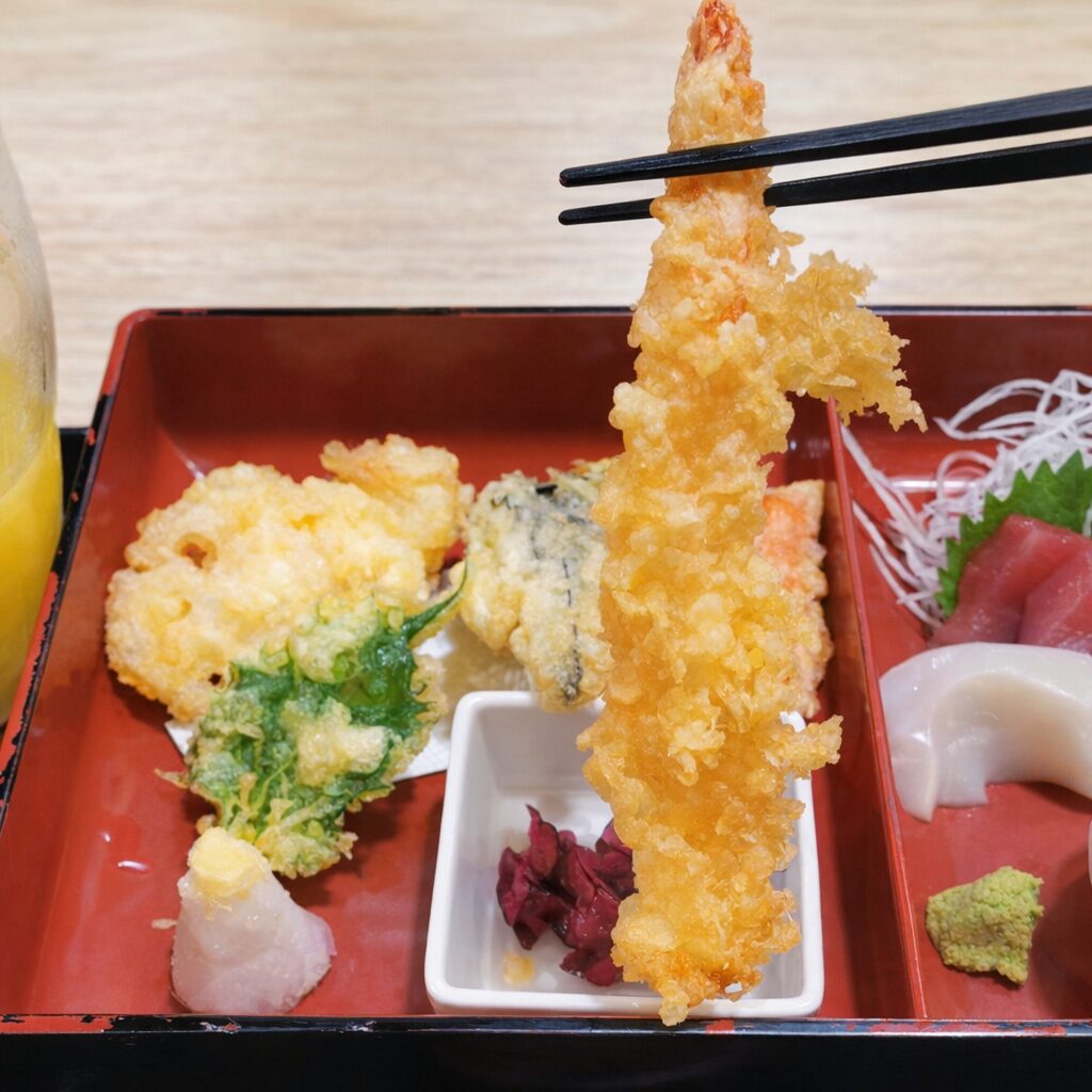 幕の内風の構成で、天ぷらに刺身、味噌汁、ご飯まで付いてこの価格はかなり頑張っています。