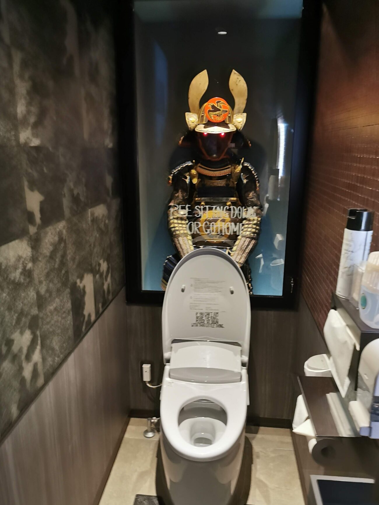 男性トイレの正面には、なんと本物の甲冑が置かれています。